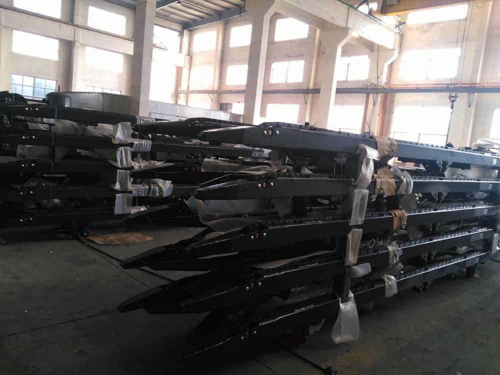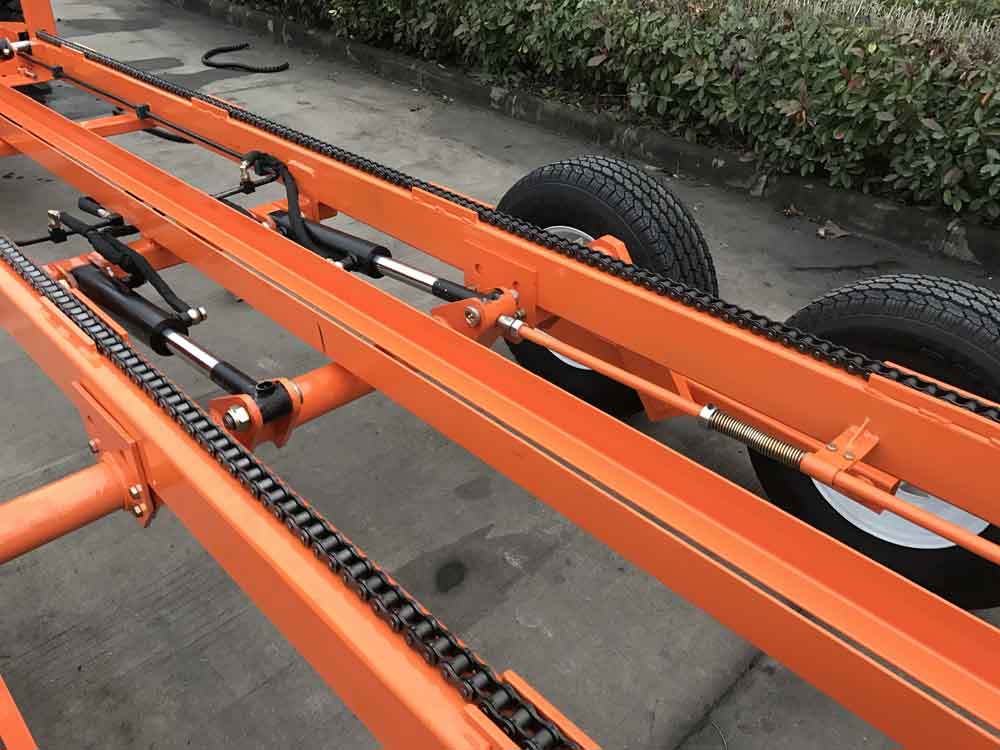 A hydraulic motor and heavy forklift chain transport the bins up and down the trailer.